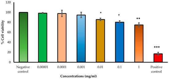 The neutral red uptake assay is commonly used for measuring cytotoxicity; it provides a quantitative assessment of the number of viable cells present in a culture [63]. It is based on the ability of cells to incorporate and bind the neutral red dye in lysosomes, which is later extracted [64]. The dye’s net charge (near zero) at physiological pH allows it to penetrate cell membranes. Within the lysosomes, there is a proton gradient to keep the pH lower than in the cytoplasm. The neutral red dye becomes charged and is hence retained in the lysosomes. However, if the cell dies or the pH gradient decreases, the dye is released [63]. In this study, the cytotoxicity of Cs NPs was assessed by subjecting HLEC cells to different concentrations of the nanoparticles (ranging from 1 × 10−5 to 1 mg/mL) using the NRU assay. Cell viability was determined by comparing the obtained results to those of the negative control (treatment medium), as shown in Figure 11. Hydrogen peroxide was employed as a positive control, and it yielded a considerably low cell viability of 17%, reflecting its cytotoxic effects. Hydrogen peroxide is an oxidizing agent that can damage cells and cause their death. The cells showed great tolerance to low concentrations of Cs NPs (ranging from 1 × 10−5 to 1 × 10−3 mg/mL), as evidenced by a cell viability of over 94%. However, when the concentration was increased to 1 mg/mL, cell viability decreased significantly to 75% (p < 0.05). This is in line with previous studies indicating that Cs NPs exhibit concentration-dependent cytotoxicity, where higher concentrations lead to more severe cytotoxicity [65].