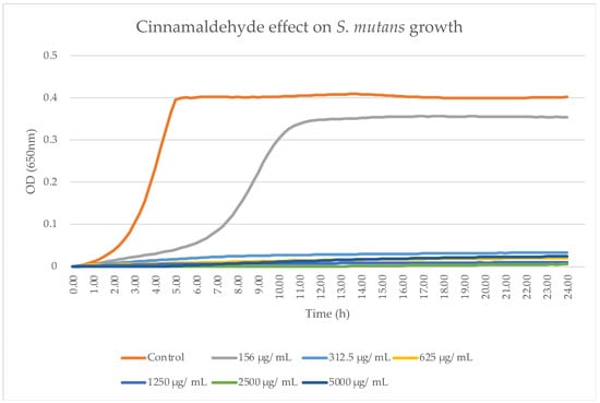 Antibacterial activity of TC. S. mutans kinetic growth was analyzed after 24 h in a microplate reader. Each point on the curve represents the mean absorbance (OD650 nm) concurrently measured in four wells that were uniformly prepared within a microtiter plate. Bacterial growth was not found at concentrations of 625 μg/mL and above (each experiment was repeated twice).