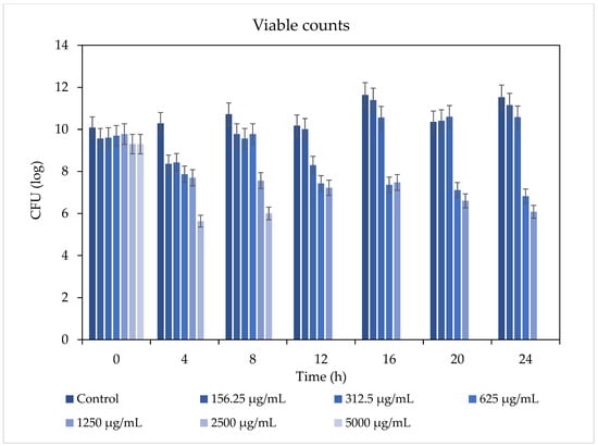 The total bacterial growth inhibition was observed using 5000 μg/mL after 4 h and using 2500 μg/mL concentrations after 12 h. Hence, the MBC dose observed was 2500 μg/mL. Furthermore, the 312.5–2500 μg/mL concentrations reduced colony formation for 24 h with respect to the untreated S. mutans control, as can be seen in Figure 3. The antibacterial effect was time- and dose-dependent.