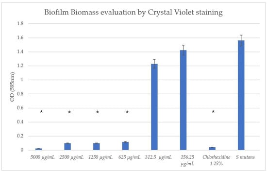 Following the initial formation of the biofilm, the treatment with TC concentrations of ≥312.5 μg/mL significantly reduced the biofilm formation compared to the untreated S. mutans control, as can be seen in Figure 7.