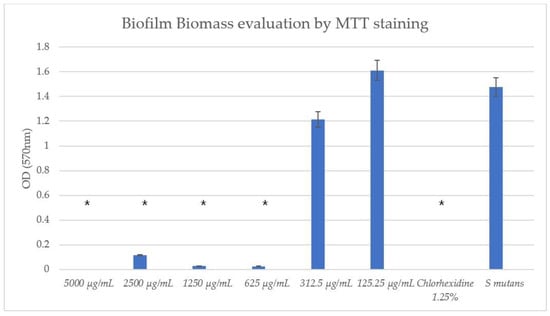 Biofilm colorimetric assay with MTT. The MTT assay showed statistically significant effects after 1 h of incubation using ≥625 μg/mL concentrations of TC. * p < 0.05 (eight wells per concentration, three repetitions).