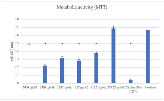 The TC concentrations ≥ 625 μg/mL exhibited a statistically significant antibiofilm effect compared to the untreated S. mutans control with both the CV and MTT assays, as can be seen in Figure 5 and Figure 6, respectively. It can be seen that concentrations of 312.5 μg/mL and 125.25 μg/mL had no significant effect on biofilm biomass compared to the untreated S. mutans.