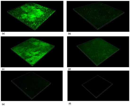 Live/dead staining with SYTO9. Microscope’s three-dimensional images of biofilm formed on hydroxyapatite discs. Surface dimensions are 1493.91 μm × 1493.91 μm. (a) S. mutans, (b) chlorhexidine 1.25%, (c) TC 156.25 μg/mL, (d) TC 312.5 μg/mL, (e) TC 625 μg/mL, and (f) TC 1250 μg/mL. Antibiofilm effect was observed using concentrations ≥625 μg/mL.