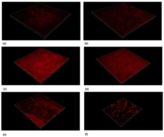 Live/dead staining with PI. Microscope’s three-dimensional images of biofilm formed on hydroxyapatite disks. Surface dimensions are 1493.91 μm × 1493.91 μm. Images show the dead bacteria population using the sub-MBC of TC. An antibiofilm effect was observed using concentrations ≥ 625 μg/mL. (a) S. mutans, (b) chlorhexidine 1.25%, (c) TC 156.25 μg/mL, (d) TC 312.5 μg/mL, (e) TC 625 μg/mL, and (f) TC 1250 μg/mL.