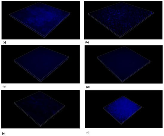 Extracellular polysaccharide (EPS) staining. Microscope’s three-dimensional images of biofilm formed on hydroxyapatite discs. Surface dimensions are 1493.91 μm × 1493.91 μm. Dextran blue fluorescence dye was used to demonstrate the effect of TC on the biofilm. The use of TC caused a reduction in the blue fluorescence compared to the untreated control. (a) S. mutans, (b) chlorhexidine 1.25%, (c) TC 156.25 μg/mL, (d) TC 312.5 μg/mL, (e) TC 625 μg/mL, and (f) TC 1250 μg/mL.