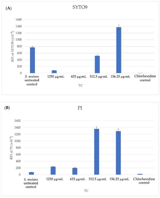 Furthermore, the PI staining demonstrated that the TC caused an elevated dead bacteria population compared to the control.