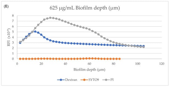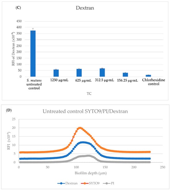 Spinning-disk confocal microscopy (SDCM) analysis. Quantitative analysis of the staining with SYTO9 (all bacteria), PI (dead bacteria), and dextran (extracellular polysaccharides) using relative fluorescence intensities (RFIs). Quantifications of the areas under the curves of SYTO 9 (A), PI (B), and dextran (C) in every biofilm layer, recorded every 2.5 μm. The relative fluorescence intensities (RFIs) of PI/SYTO 9/dextran in the biofilms of untreated control (D) and 625 μg/mL TC-treated samples (E).