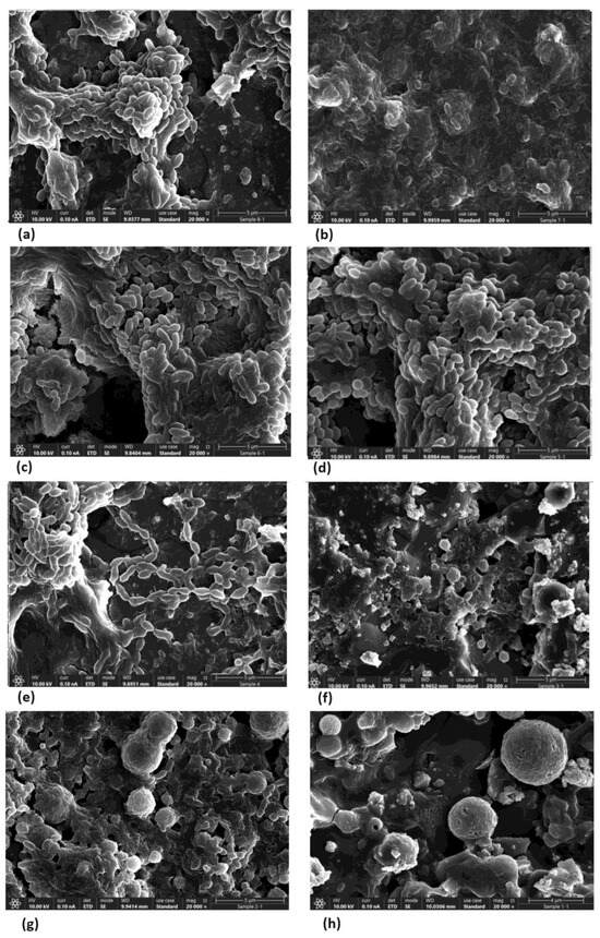 In the control, bacteria with intact membranes and dividing cells can be observed. The sub-MBC TC doses reduced the S. mutans density compared to the untreated control, as can be seen in Figure 12a–h. The bacteria in the different treatment groups showed changes in morphology with abnormal cell division, as highlighted in Figure 12. The use of increasing concentrations of the tested TC caused morphological changes and reduced the numbers of bacteria.