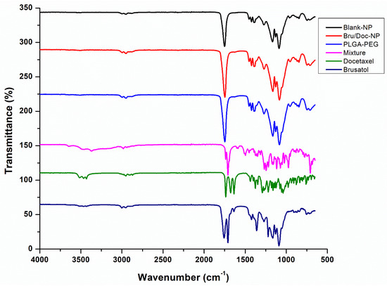 To evaluate potential interactions between the two drugs and components of the nanoparticle formulation and to qualitatively evaluate the efficiency of encapsulation of both drugs, FT-IR spectra were acquired for blank nanoparticles, brusatol- and docetaxel-loaded nanoparticles, pure brusatol, pure docetaxel, PLGA-PEG polymer, and physical admixture of polymer and drugs. The acquired spectra were overlaid (Figure 3). No drug peaks could be seen in the spectrum obtained for drug-loaded nanoparticles, while drug peaks are visible in the spectrum obtained for the admixture of polymer and drugs. In addition, the spectra obtained for the PLGA-PEG polymer, drug-loaded nanoparticles, and for blank nanoparticles are comparable and superimposable, suggesting that the drugs are completely encapsulated by the polymer.