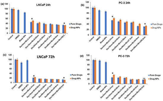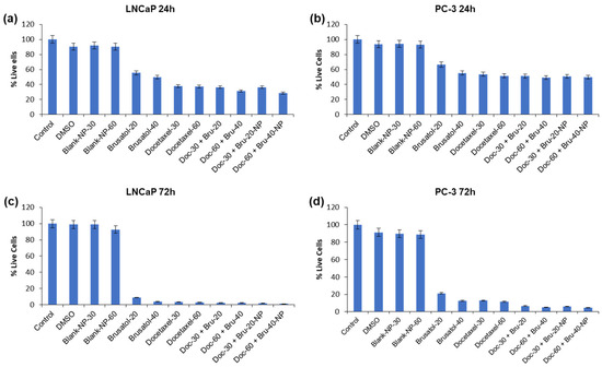 The viable cell count was performed by seeding LNCaP and PC-3 cells in 12-well plates at 1.5 × 105 cells/mL. After 24-h incubation, the cells were treated with different concentrations of pure docetaxel (30 nM, 60 nM), pure brusatol (20 nM, 40 nM), combination drug solution (20 nM brusatol + 30 nM docetaxel; 40 nM brusatol + 60 nM docetaxel), and nanoparticle formulations containing same drug concentrations as combination drug solutions and incubated for 24 h and 72 h. The controls used include blank nanoparticles at concentrations equivalent to the dual-drug loaded nanoparticles, DMSO at the same concentration used for dissolving the pure drugs and cell culture media. Cell counts at 24 h and 74 h for the different treatments was achieved by mixing 10 µL of cell suspension with 10 µL of 0.4% trypan blue staining solution followed by the counting of live cells using an automated cell counter (Countess IITM–Thermo Fisher Scientific, Waltham, MA, USA). The experiments were conducted in triplicate. The percentage of viable cells was determined by comparing the mean cell count of live cells in the treated samples with that of the cell culture media controls using the equation below: