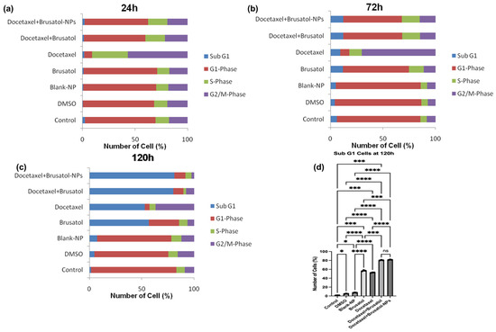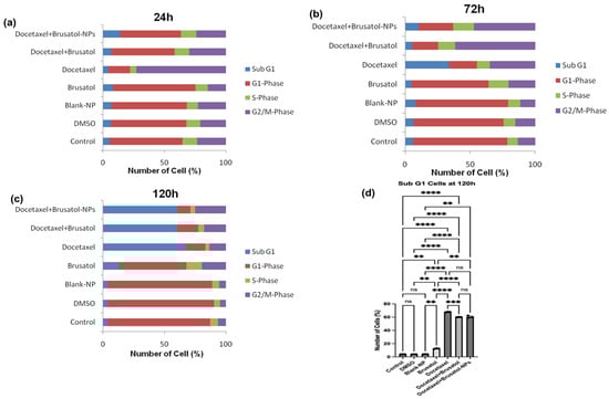 This was carried out using a modified published method [32]. LNCaP cells were seeded in 12-well plates at 2 × 105, 1.5 × 105, and 1 × 105 cells/mL for the evaluation of cell cycle arrest at 24 h, 72 h, and 120 h, respectively. Similarly, PC-3 cells were seeded in 12-well plates at 1 × 105, 7.5 × 104, and 5 × 104 cells/mL for the evaluation of cell cycle arrest at 24 h, 72 h, and 120 h, respectively. After 24-h incubation, the cells were treated with different concentrations of docetaxel solution (60 nM), brusatol solution (40 nM), combination drug solution (40 nM brusatol + 60 nM docetaxel), and nanoparticle suspension containing same drug concentrations as the combination drug solution and incubated for 24 h, 72 h, and 120 h. The controls used included blank nanoparticles at concentrations equivalent to the dual-drug loaded nanoparticles, DMSO at the concentration used for dissolving the pure drugs and cell culture media. At each time point, cells were harvested, washed with PBS and fixed with 70% ethanol solution overnight at −20 °C. After fixation, the cells were washed with PBS followed by centrifugation (2×). The cells were subsequently stained with 400 μL of FxCycleTMPI/RNase staining solution and incubated for 30 min at room temperature in the dark before flow cytometry analysis. Data were collected using a BD FACSVerse flow cytometer (BD Biosciences) and analyzed using FlowJo software version 10.4.0 (Tree Star Inc., Ashland, OR, USA). The results represent the average of three independent experiments.
