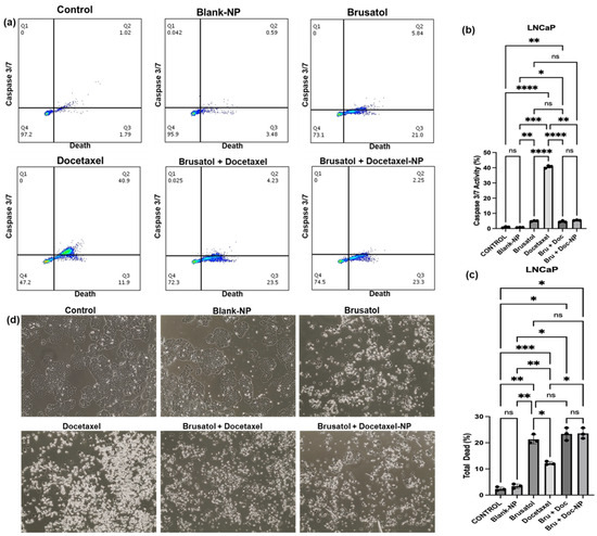 Caspase activity was evaluated using the CellEventTM Caspase-3/7 Green Flow Cytometry Assay Kit by modifying a published protocol [33]. LNCaP and PC-3 cells (2.5 × 105 cells/mL) were seeded in 6-well plates. After a 24-h incubation period, cells were treated with brusatol solution (40 nM), docetaxel solution (60 nM), combination drug solution (40 nM brusatol + 60 nM docetaxel), and nanoparticle suspension containing the same drug concentration as the combination drug solution for 72 h. Control cells were incubated with cell culture media. After 72 h, cells were harvested, and the cell suspension was made up to a 1 mL volume in flow cytometry tubes. CellEventTM Caspase-3/7 Green Detection Reagent (1 µL) was added to each sample tube and incubated for 25 min at 37 °C. SYTOX®AADvanced™ dead cell stain solution (1 mM; 1 μL) was added to the samples and incubated at 37 °C for 5 min. Samples were analyzed using a flow cytometer equipped with a 488 nm laser and 530/30- and 690/50 BP filters for fluorescence excitation following the manufacturer’s protocol.