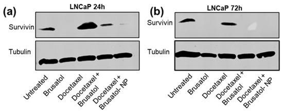 For the 72-h studies, the downregulated expression of survivin was observed in LNCaP cells after treatment with docetaxel for 72 h compared to 24-h data. This downregulation in survivin levels could be correlated with the percentage of cells in the G2/M phase based on the cell cycle assay data discussed above when 24-h and 72-h data are compared. This time-dependent reduction in survivin levels when compared with the observed overexpression at 24 h may be one of the mechanisms responsible for the time-dependent increase in docetaxel cytotoxicity at longer treatment times. Additionally, the inhibition of survivin protein expression was observed at 72 h in LNCaP cells treated with brusatol (Figure 14b). Thus, no time-dependent difference in expression was observed in LNCaP cells treated with brusatol.