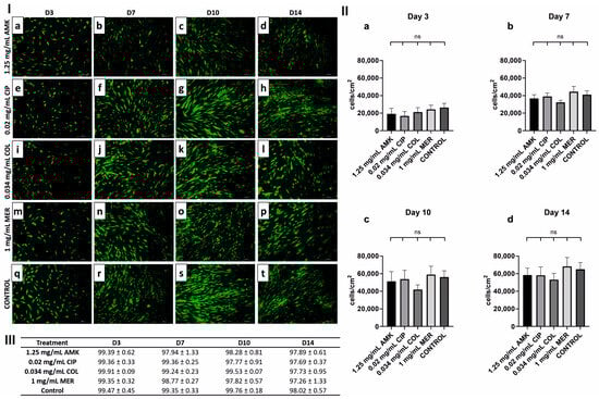 Cell viability and proliferation in HFs after antibiotic treatment on days 3, 7, 10, and 14. (I) Viability of HFs after each treatment and the control on days 3, 7, 10, and 14. (a–d) LIVE/DEAD® images of HFs after AMK (1.25 mg/mL) treatment on days 3, 7, 10, and 14, respectively. (e–h) HFs after CIP (0.02 mg/mL) treatment on days 3, 7, 10, and 14, respectively. (i–l) HFs after COL (0.034 mg/mL) treatment on days 3, 7, 10, and 14, respectively. (m–p) HFs after MER (1 mg/mL) treatment on days 3, 7, 10, and 14, respectively. (q–t) Control (without treatment) on days 3, 7, 10, and 14, respectively. Dead cells are shown in red and live cells in green. Representative images are shown; n = 3 experiments. Magnification 10×. (II) Bar graph showing the cell density in HFs on (a) day 3, (b) day 7, (c) day 10, and (d) day 14 of treatment. ns: No statistically significant differences were observed. (III) Cell viability percentage of HFs after treatments. AMK, amikacin; CIP, ciprofloxacin; COL, colistin; MER, meropenem. n = 3 experiments. The absence of an asterisk indicates statistically non-significant differences as compared to the control group, p > 0.05.