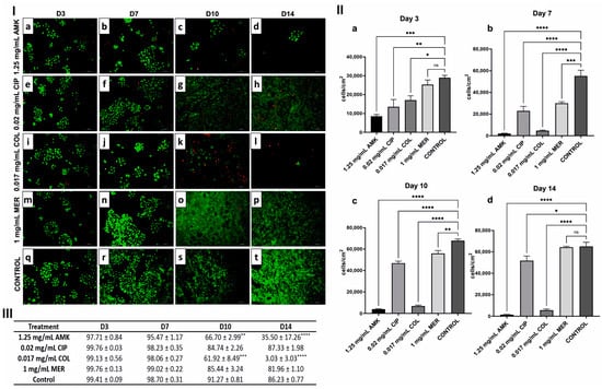 Cell viability was affected after AMK and COL after 14 days of follow-up compared to CIP and MER and control (Figure 2II–III).