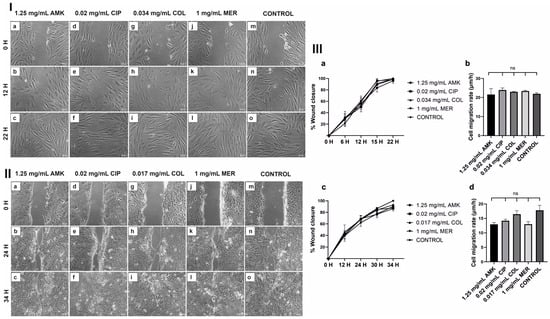 Wound closure in HFs and hKTs after antibiotic treatments. Most representative images are shown. For additional information see Figures S3 and S4. (I) (a–c) The wound closure assay was performed on HFs after treatment with 1.25 mg/mL AMK at 0, 12, and 22 h after scratching, respectively. (d–f) The HFs were treated with 0.02 mg/mL CIP at 0, 12, and 22 h after scratching, respectively. (g–i) The HFs were treated with 0.034 mg/mL COL at 0, 12, and 22 h after scratching, respectively. (j–l) The HFs were treated with 1 mg/mL MER at 0, 12, and 22 h after scratching, respectively. (m–o) The control group was observed at 0, 12, and 22 h after scratching, respectively. n = 3. Magnification 10×. (II) (a–c) The wound closure assay was performed on hKTs after treatment with 1.25 mg/mL AMK at 0, 24, and 34 h after scratching, respectively. (d–f) hKTs were treated with 0.02 mg/mL CIP at 0, 24, and 34 h after scratching, respectively. (g–i) hKTs were treated with 0.017 mg/mL COL at 0, 24, and 34 h after scratching, respectively. (j–l) hKTs were treated with 1 mg/mL MER at 0, 24, and 34 h after scratching, respectively. (m–o) Control samples were taken at 0, 24, and 34 h after scratching, respectively. n = 3. Magnification 10×. (III) Wound closure and cell migration rate in HFs and hKTs after antibiotic treatments. (a) Percentage of wound closure ± SEM in HFs at 0, 6, 12, 15, and 22 h. (b) Bar graph of average HFs migration rate (µm/h) at 0, 6, 12, 15, and 22 h. (c) Percentage of wound closure ± SEM in hKTs at 0, 12, 24, 30, and 34 h. (d) Bar graph of average hKTs migration rate (µm/h) at 0, 12, 24, 30, and 34 h. ns: no significant differences.