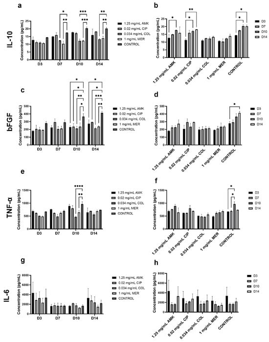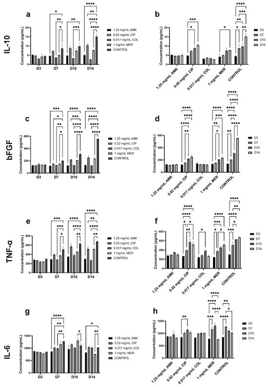 Regarding IL-10 analysis, at days 7, 10, and 14, the secretion was significantly reduced after AMK and COL compared to the control. At days 7 and 14, MER treatment also reduced IL-10 concentration. This reduction was less pronounced than after AMK and COL. The concentration of IL-10 increases with time after CIP and MER as in the control group. After AMK and COL treatments, no significant differences were observed regarding the follow-up time. A similar pattern to IL-10 is observed for bFGF. At days 7, 10, and 14, all antibiotic treatments significantly reduced bFGF secretion when compared to the control. However, these reductions were higher after AMK and COL. Furthermore, the secretion of bFGF increased significantly with time after CIP and MER treatments and in the control group but no significant differences were observed after AMK and COL treatments. TNF-α secretion, at days 7 and 10, was significantly reduced after AMK, COL, and MER treatments when compared to the control. At day 14, all antibiotic treatments significantly reduced TNF-α concentration. These reductions were more accentuated after AMK and COL treatments. A similar progression to control was observed in the secretion of this cytokine after treatment CIP and MER treatments compared to AMK and COL treatments. The level of IL-6 concentration was significantly increased in the control group with respect to AMK, CIP, and COL at day 7. At day 10, MER significantly increased the IL-6 level compared to the control. But, at day 14, this treatment significantly reduced IL-6 concentration. AMK also reduced this concentration when compared to the control. Regarding the secretion pattern through time, significant increases in the concentration of this cytokine were observed at days 7 and 10 with respect to days 3 and 14 after CIP and MER treatments and in the control group. However, no significant differences were observed regarding AMK and COL treatments.
