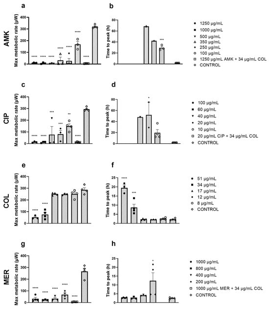 Real-time calorimetric measurement of P. aeruginosa-infected HFs after AMK treatment (a,b), CIP treatment (c,d), COL treatment (e,f), and MER treatment (g,h). Controls are included in each condition. Combinations of every antibiotic with COL are included in the corresponding graph; (a,b) for AMK–COL combination, (c,d) for CIP–COL combination, and (g,h) for MER–COL combination. n = 3. AMK, amikacin; CIP, ciprofloxacin; COL, colistin; MER, meropenem. * p ≤ 0.05; ** p ≤ 0.03; *** p ≤ 0.008; **** p ≤ 0.0001. Absence of an asterisk means no significant difference.