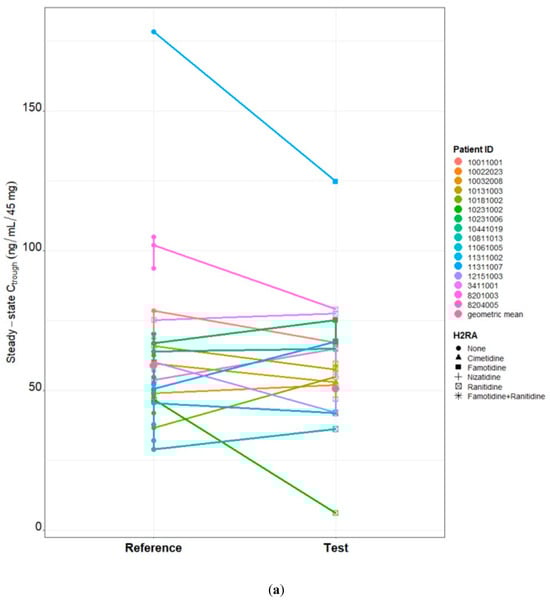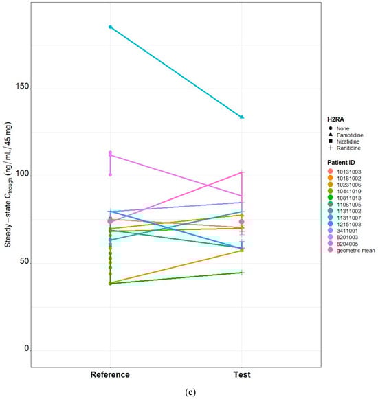 The effect of concomitant H2RA use (test) on dacomitinib parent, metabolite and active moiety Ctrough,ss was evaluated by a linear mixed effects model and the test group was not statistically significant compared to the reference group (p = 0.1245, 0.6611 and 0.9668). Time was also evaluated in the model and was not significant (p = 0.6628, 0.9558 and 0.7304). The results of the statistical model showed that the geometric mean ratios (test/reference), expressed as a percentage, are 85.88% with a 90% CI of 72.9 to 101.1, 103.82% with a 90% CI of 89.9 to 119.8 and 99.77% with a 90% CI of 90.9 to 109.5, respectively. The results are consistent with the visual presentation of dacomitinib Ctrough,ss reference and test values by patient (Figure 1).