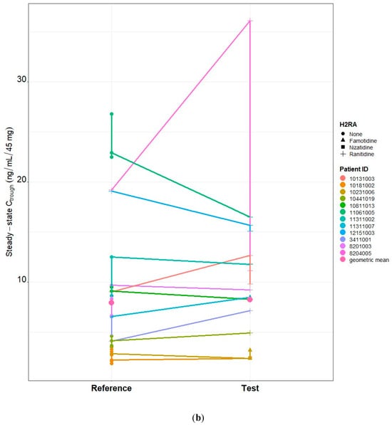 As shown in Table 3, across the 11 studies (1450 patients treated with dacomitinib), there were 1001 patients with available dacomitinib Ctrough,ss meeting the criteria defined in Section 3.1, and 86 total patients reported use of an H2RA. The within-patient H2RA–dacomitinib Ctrough,ss analysis population consisted of 16 total patients with 57 dacomitinib Ctrough,ss in the reference or test group. Of these 16 patients, 12 had metabolite and active moiety concentrations in the analysis population with 46 metabolite and active moiety Ctrough,ss in the reference or test group.