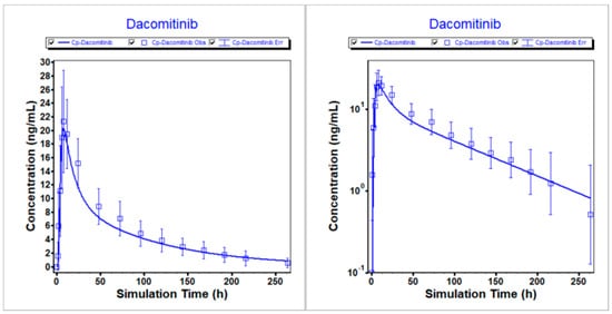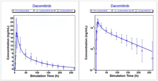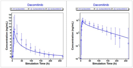 Simulated vs. observed PK profiles following 45 mg dacomitinib in fasted state. (Left) Linear scale. (Right) Logarithmic scale.