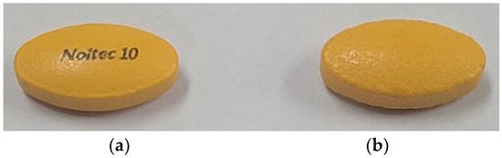Formulation images of Ila and Ila-Xyl cocrystal: (a) Ila formulation (brand name: Noltec (10 mg as Ila)); (b) Ila/Xyl cocrystal (10 mg as Ila).