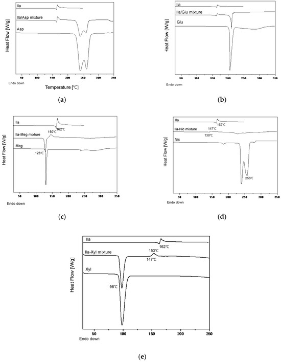Ila cocrystal screening using DSC: (a) Ila, Asp and Ila/Asp (1:1) physical mixture; (b) Ila, Glu and Ila/Glu (1:1) physical mixture; (c) Ila, Meg and Ila/Glu (1:1) physical mixture; (d) Ila, Nic and Ila/Nic (1:1) physical mixture; and (e) Ila, Xyl and Ila/Xyl (1:1) physical mixture.