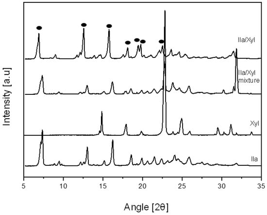 PXRD pattern of Ila, Xyl, Ila/Xyl physical mixture and Ila/Xyl crystal obtained by co-crystallization.