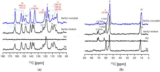 Ila/Xyl (1:1) cocrystal, Ila, Xyl, and Ila/Xyl (1:1) physical mixture’s solid-state CP/MAS 13C-NMR: (a) 90–180 ppm; (b) 0 ppm–90 ppm (numbers on the peaks are related to numbers in Figure 1 structure location). (The spectrum of the Ila/Xyl cocrystal is displayed in blue).