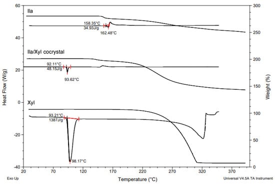 To perform thermogravimetric analysis of Ila/Xyl cocrystals, a TGA Q50 (TA Instruments, Philadelphia, PA, USA) was used in a nitrogen atmosphere. The temperature range was set from 30 °C to 400 °C, and the scan rate was 10 °C/min.