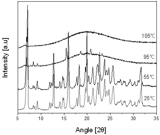 In the results, at 25 °C and 55 °C, the PXRD patterns maintain the same 2θ values, indicating the stability of the cocrystal. However, at 95 °C, which corresponds to the endothermic temperature observed in Figure 8, the PXRD pattern is nearly disappearing. Furthermore, at 105 °C, no distinct peaks related to 2θ are observed, indicating the complete absence of the characteristic PXRD pattern. This suggests that from 95 °C onward, the Ila/Xyl cocrystal melts, and the PXRD pattern is not evident. Therefore, the temperature of the DSC endothermic peak in Figure 8, representing the Ila/Xyl cocrystal, can be predicted as the melting temperature by observing the VT-PXRD pattern changes.