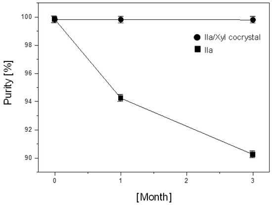 Purity results analyzed after 3 months of storage at 25 ± 2 °C and RH 60 ± 5% for Ila and Ila/Xyl cocrystal (error bar: test for six repetitions).