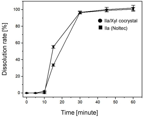 Dissolution rate test at pH 10 for Ila/Xyl cocrystal formulation (Dosage: 10 mg) and Ila Noltec formulation (dosage: 10 mg) (refer to the formulation images in Figure 3) (error bar: test for six repetitions).