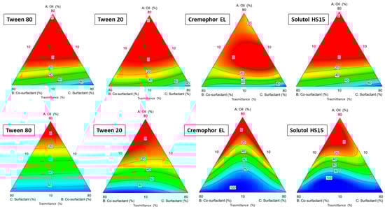 The ratio between the phases varied in each experiment, keeping the sum of the three phases constant at 1 g in the final SNEDDS. The % transmittance was evaluated in a range from 0.1 to 100% for the various emulsions produced. The blue zone indicated an emulsion with a high % transmittance, followed by the green, orange, and finally red zones, which indicated increasingly lower transmittances down to 0.1 (red zone). Obtaining a transmittance close to 100% suggested a globule size below 100 nm. As Figure 2 shows, Capryol® PGMC allowed to produce emulsions with a high degree of transmittance. When comparing the graphs, it is possible to see a higher concentration of blue areas in the graphs produced with Capryol® PGMC. Both are propylene glycol mono- and diesters of caprylic acid (C8) but with different fractions of monoesters [32]. This slightly different composition, combined with a different behavior with the various surfactants, gave rise to differences in terms of spontaneous nanoemulsification in favor of Capryol® PGMC. It had already demonstrated its superiority over Capryol® 90 in terms of self-nanoemulsification efficiency in many mixtures with different surfactants [33].