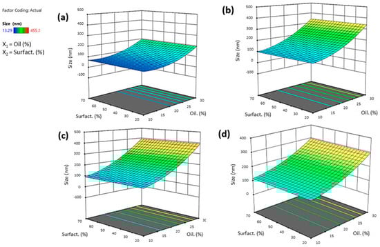 The ANOVA analysis of the full regression models showed that only some factors were statistically significant; thus, statistically non-significant terms were removed except for terms needed for hierarchy in the reduced regression model. The quality of the fit of the experimental data using the reduced quadratic models was assessed based on several statistical criteria. Taking into account the R2 parameter, the quadratic model was considered the most significant since Adjusted R2, given by the software, was close to Predicted R2. Moreover, the generated model F-value of 9.77 implies the model is significant. The term B, which refers to co-surfactant concentration, was excluded by the model because it had no significant influence on globule size. When both oil and surfactant concentrations were increased, globule size decreased due to the oil’s dominant influence over the surfactant. Indeed, oil concentration appeared to be the factor most influential on the mean size response, with an estimated coefficient equal to +111.97. A positive coefficient revealed a direct relationship between the variable and the response. As shown by the response surface graphs, an increase in oil concentration produced larger particles (Figure 3). Smaller particle sizes were observed when using Tween® 80, as represented in response surface graphs (Figure 3). Tween 80® allows for better stabilization of nanoemulsions, forming a protective layer around the micelles and preventing their aggregation. It also has a controlling role in the whole emulsification process, reducing the surface energy and leading to the inhibition of crystal growth during the entire process [36]. The square bracket in polynomial Equation (1) indicates an optional third parameter associated with the level of that factor implied in the polynomial regression. For example, the influence associated with the type of surfactant depends mainly on the first level with Tween® 80 and on the second level and thus on Tween® 20 (a result that perfectly corroborates the response surface plots below).