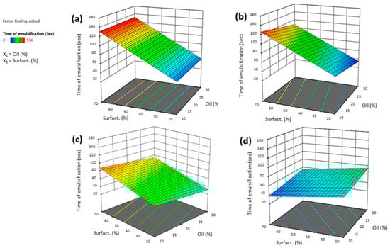 3.3.2. Effect of Independent Variables on Time of Emulsification