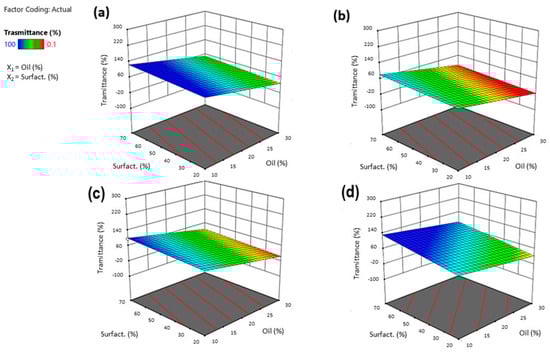 The obtained % transmittance for all experiments was in the range 0.1–100 ± 0.10%. Just as in the case of size, for transmittance, the most influential factor was the amount of oil. Transmittance and particle size are closely linked: a high optical clarity (90–100%) stands for globules with a size smaller than 50 nm. In contrast, a low transmittance indicates that the emulsion formed is not clear and will certainly contain particles of the order of more than 100 nm.