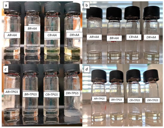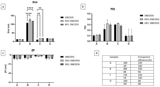 RSV-SNEDDS (AR, BR, CR, DR, where A, B, C, D indicate the different surfactants and R indicates the addition of RSV) were prepared by mixing the oil (Capryol® PGMC), respective surfactant (A = Tween® 80; B = Tween® 20; C = Cremophor® EL, and D = Solutol® HS15), and cosurfactant (Transcutol® P) at predetermined amounts, defined by optimization, until reaching a transparent and homogeneous solution. An appropriate amount of RSV (2 mg/g) was then added, and the blend was mixed at room temperature using a magnetic stirrer until complete dissolution of RSV. The prepared formulations were stored for further studies out of the light. The same procedure was used to prepare MEL-SNEDDS in order to achieve four different formulations (AM, BM, CM, DM) with 2 mg/g of MEL in the mixtures.