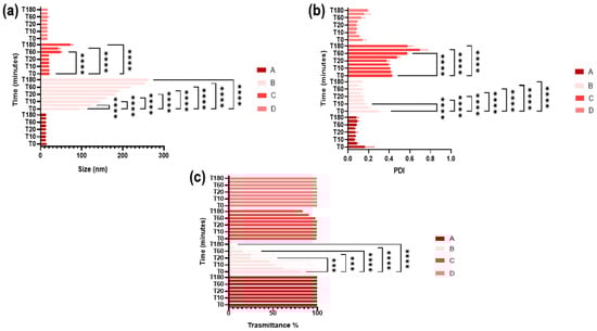 To evaluate the stability of SNEDDS in the ocular environment, the pre-SNEDDS were diluted in a ratio of 1 to 10 with STF and placed in a climatic chamber at 37 °C. At time intervals (5, 10, 15, 20, 30, 60, 120, and 180 min), they were analyzed for size, PDI, and % transmittance.