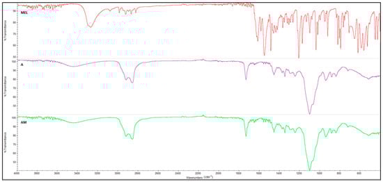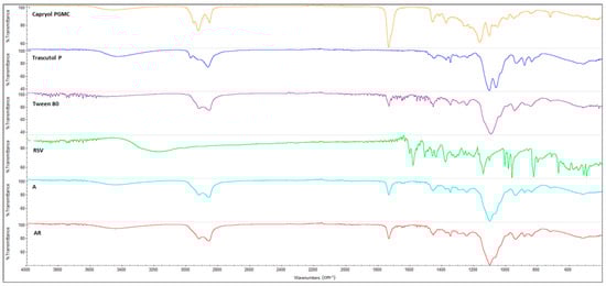 FT-IR spectrophotometer (Perkin-Elmer Spectrum RX I, Waltham, MA, USA) was employed for the measurement of pure materials (Capryol® PGMC, Transcutol® P, Tween® 80, RSV, and MEL), blank SNEDDS, RSV-SNEDDS, and MEL-SNEDDS. The tool was equipped with an attenuated total reflectance (ATR) accessory, a diamond window, and zinc selenide crystal (diamond/ZnSe). For each sample, 64 scans were collected at room temperature over the 4000–600 cm−1 range at a resolution of 4 cm−1. Any background absorption was subtracted before each analysis.