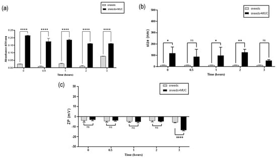 The mucoadhesion study was performed with the formulation produced with Tween® 80 (A). Pre-SNEDDS were reconstituted with STF (1:10 by volume), and the formed nanoemulsion was incubated with porcine mucin (0.1%, w/v) dispersion (1:1, v/v) in STF at 37 °C. Mean globule size, % transmittance, and ZP were measured after 0, 30 min, 1, 2, and 24 h of incubation.