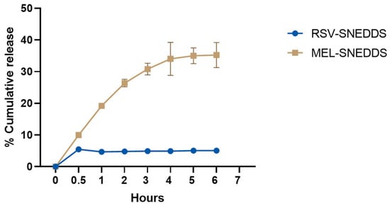 The release rate constant was estimated from the slope of the different curves, and regression values (R2) were obtained. Table 7 shows that the in vitro MEL release from SNEDDS was best described by both the Higuchi equation (R2 = 0.8685) and the Korsmeyer–Peppas equation (R2 = 0.8863). The former equation indicates that the drug release occurred via diffusion through the dispersed globules in a constant and controlled manner [63]. The second equation showed a diffusional release exponent parameter, indicated with n, which was 0.414. This suggests a quasi-Fickian diffusion profile (when n < 0.45) of MEL release [64]. Regarding the in vitro RSV release, this was best described by Korsmeyer–Peppas equation (R2 = 0.9736) with n = 0.084, indicating again a quasi-Fickian diffusion profile [64].