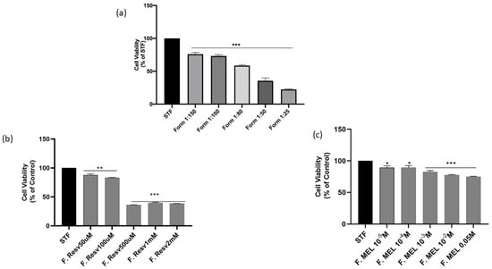 Effect of (a) blank formulation treatment on SIRC cell viability; (b) Cell viability of SIRC cultured in STF, representing the control group, or treated with different concentrations of AR (50 μM, 100 μM, 500 μM, 1 mM or 2 mM) for 5 min, or (c) with different concentrations of AM (10−5 M, 10−4 M, 10−3 M, 10−2 M, 0.05 M). * p < 0.05, ** p < 0.01, *** p < 0.001.
