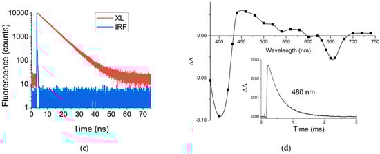 The efficiency of intersystem crossing processes in XL was evaluated with triplet state quantum yield determination using laser flash photolysis setup. As a reference standard, we used ZnTPP solution in toluene (ΦT = 0.83, εT = 7.4 × 104 M−1·cm−1 at 470 nm [24]. We observed the linear dependence between laser excitation energy and the initial triplet state absorption for both standard and sample (Figure S1).