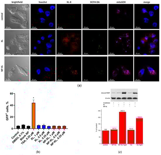 The intracellular XL and NP–XL localization in MDA-MB-231 cells was analyzed by confocal laser scanning microscopy (CLSM). A total of 2 × 104 (1 mL/well) cells were seeded on the coverslips in 24-well plates for 24 h. The next day, cells were incubated for 2 h in serum free media and treated with 100 nM XL or NP–XL for another 2 h, rinsed three times with PBS, and stained with 2.2 µM hoechst 33342. After treatment, cells were stained with 20 µM DCFH-DA and 10 µM MitoSox Red for 20 min in the dark and irradiated with a 660 nm LED with 25 mW/cm2 power for 20 min. The slides were rinsed, embedded in mowiol, and analyzed immediately by CLSM.