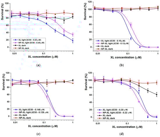 MDA-MB-231 and BJ-5TA cells were seeded in 96-well plates (5000 cells per well) 24 h before the experiment and incubated under standard conditions. K562 cells were seeded into wells (5000 cells per well) just after the XL or NP–XLs samples were added into 96-well plates. XL or NP–XLs were added in triplets in the concentration range 0.016–1 µM (according to XL concentration). To determine phototoxicity, cells were irradiated with 660 nm light-emitting diode for 20 min with a 25 mW/cm2 power LED and then incubated for 72 h. Cell survival was determined using standard MTT assay [21]; 50 µL MTT in DMEM/RPMI 1640 (1 mg/mL) was added into each well. After cell incubation for +37 °C, the medium was removed and precipitated formazan crystals were dissolved in 100 µL DMSO. Following this, the absorption intensity of formazan was measured at 540 nm on a microplate reader. Cell viability was determined as the percentage of untreated controls. The responses were measured in triplicates.