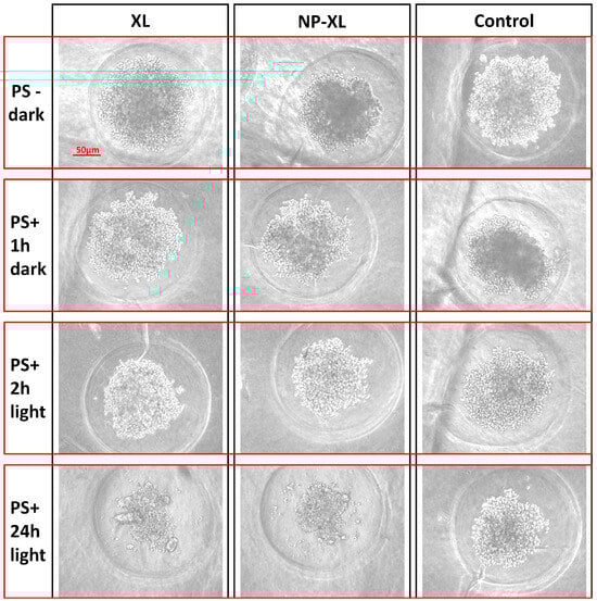 Figure 10 shows the representative images of irradiated, or non-irradiated MDA-MB-231 spheroids taken 24 h after the wells were supplemented with XL and NP–XL. The effect of XL and NP–XL was weaker compared to 2D model. This effect probably occurred due to tight cell packing with high density in spheroids, resulting in slower drug accumulation [74]. However, shorter incubation periods after light irradiation also should be taken into account—72 h in the case of 2D models and 24 h in the case of 3D models, which is explained by the difficulties of 3D culture support in plates. Thus, the IC50 values of MDA-MB-231 2D and 3D models barely could be compared directly, which did not diminish the significance high XL and NP–XL light-induced activity. Similar tendencies were described in the literature [75].
