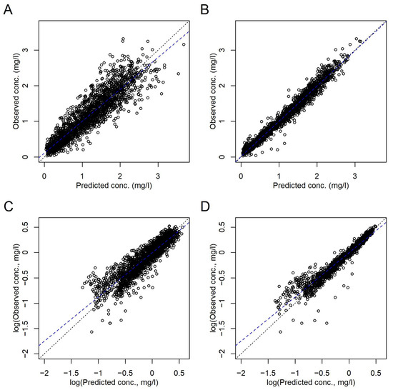 Comparison of the observed and predicted C(t) according to the final model in Table 3. (A,C) Population level. (B,D) Subject level, i.e., including random effects. (A,B) Linear axes scales. (C,D) Logarithmic axes scales. Dotted black lines, lines of identity. Broken blue lines, linear regressions.