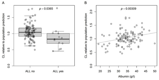 CL at the subject level relative to the respective predicted CL at the population level calculated before including the effects for ALL and albumin (on k) in the final model. (A) Boxplot for the effect of ALL; dotted line at 1, i.e., identity between predicted CL at subject and population level; p-value for Student’s t-test. (B) Scatter plot for the effect of serum albumin; dotted line, linear regression; p-value for the slope (slope = 0) of the linear regression.