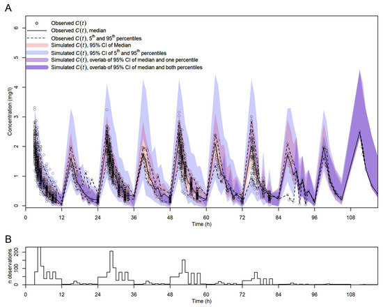 Visual predictive check for the final model. (A) vpc with observed and simulated C(t) vs. t. Symbols, lines, and shadings are as in the legend. (B) Number of observed C(t) per time point (no binning of time points).